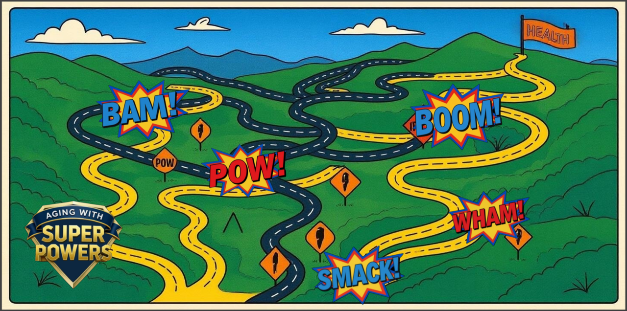 Follow the winding path through medical complexity with your field guide. Every twist and turn teaches you something new about health conditions, treatments, and aging—building your knowledge superpowers along the way.